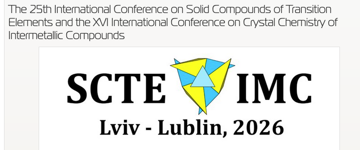 You are cordially invited to attend the 25th International Conference on Solid Compounds of Transition Elements and the XVI International Conference on Crystal Chemistry of Intermetallic Compounds. This joint meeting will serve as a forum to present and discuss new results on synthesis, characterization, properties, and applications of solid compounds of d- and f-elements, as well as intermetallic and related compounds. Both conferences have long-standing tradition. SCTE meetings have been held since 1965, in Austria, Czechia, France, Germany, Italy, Netherlands, Norway, Poland, Portugal, Spain, Sweden, Switzerland, and United Kingdom, IMC meetings since 1971, always in Lviv, Ukraine.